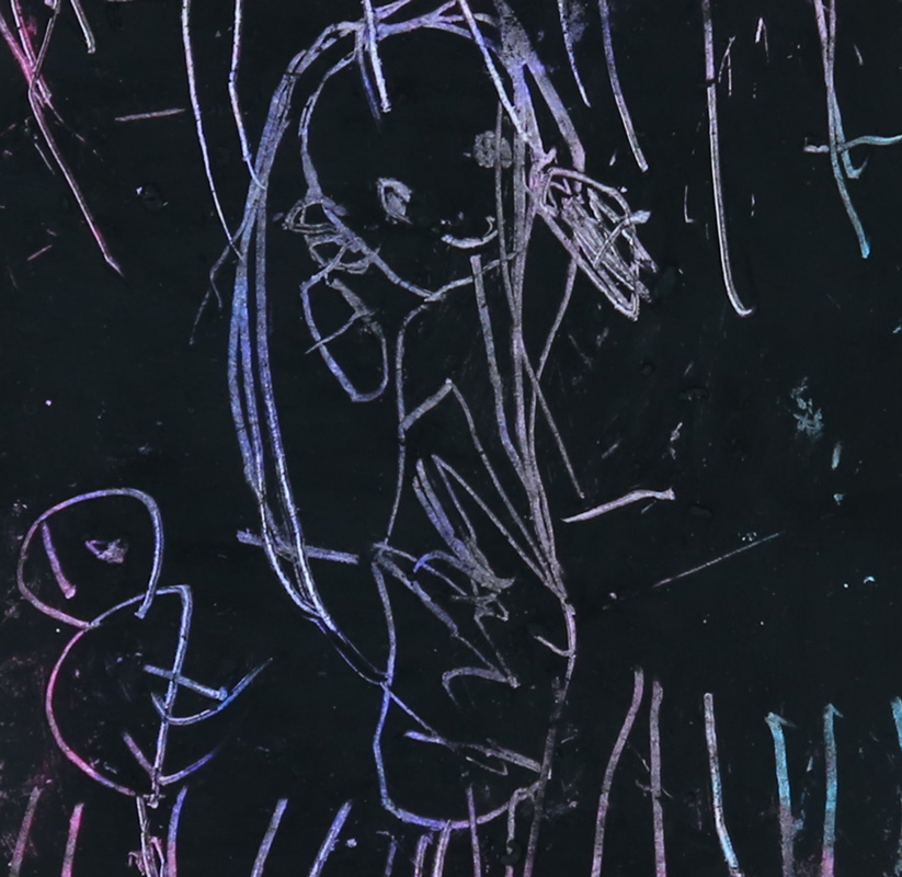 توضیح: این طرح شخصیت اصلی در آثار این کودک است. کلاهی که بالای سر آدم دیده می شود به نوعی امضای کودک است که روی سر آدم ها در کارهایش دیده می شود